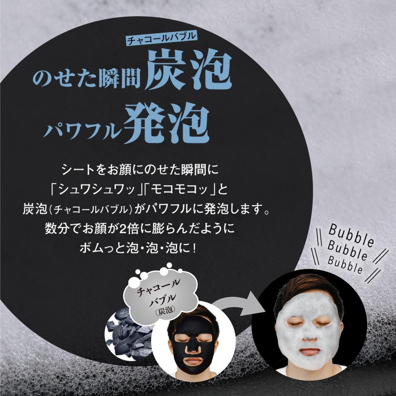 お顔にマスクをのせた瞬間から勢いよく出てくる発泡を感じることができる、炭泡洗顔マスク。